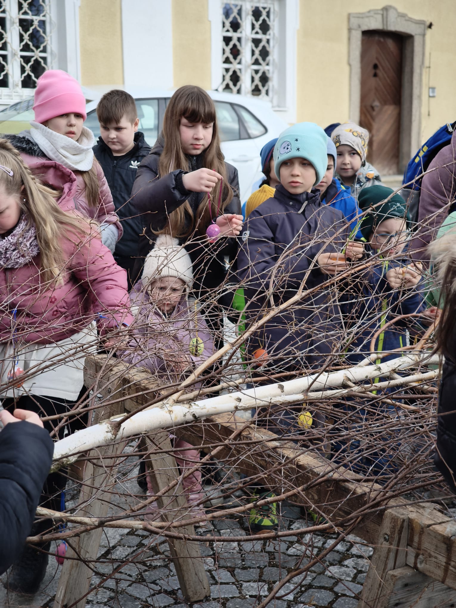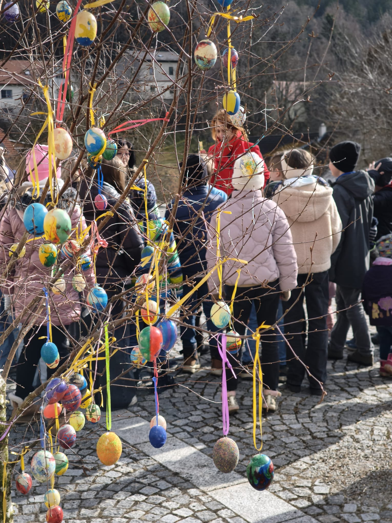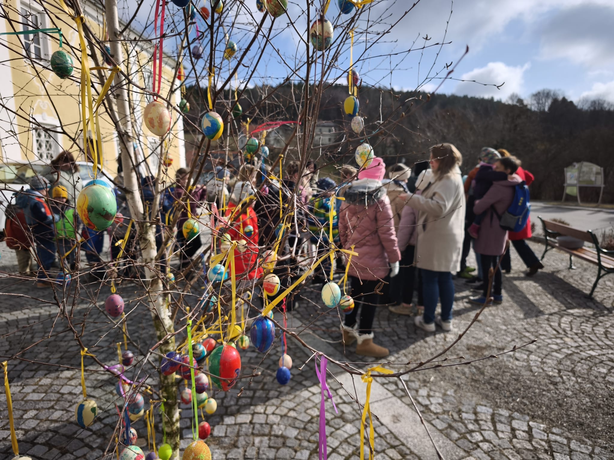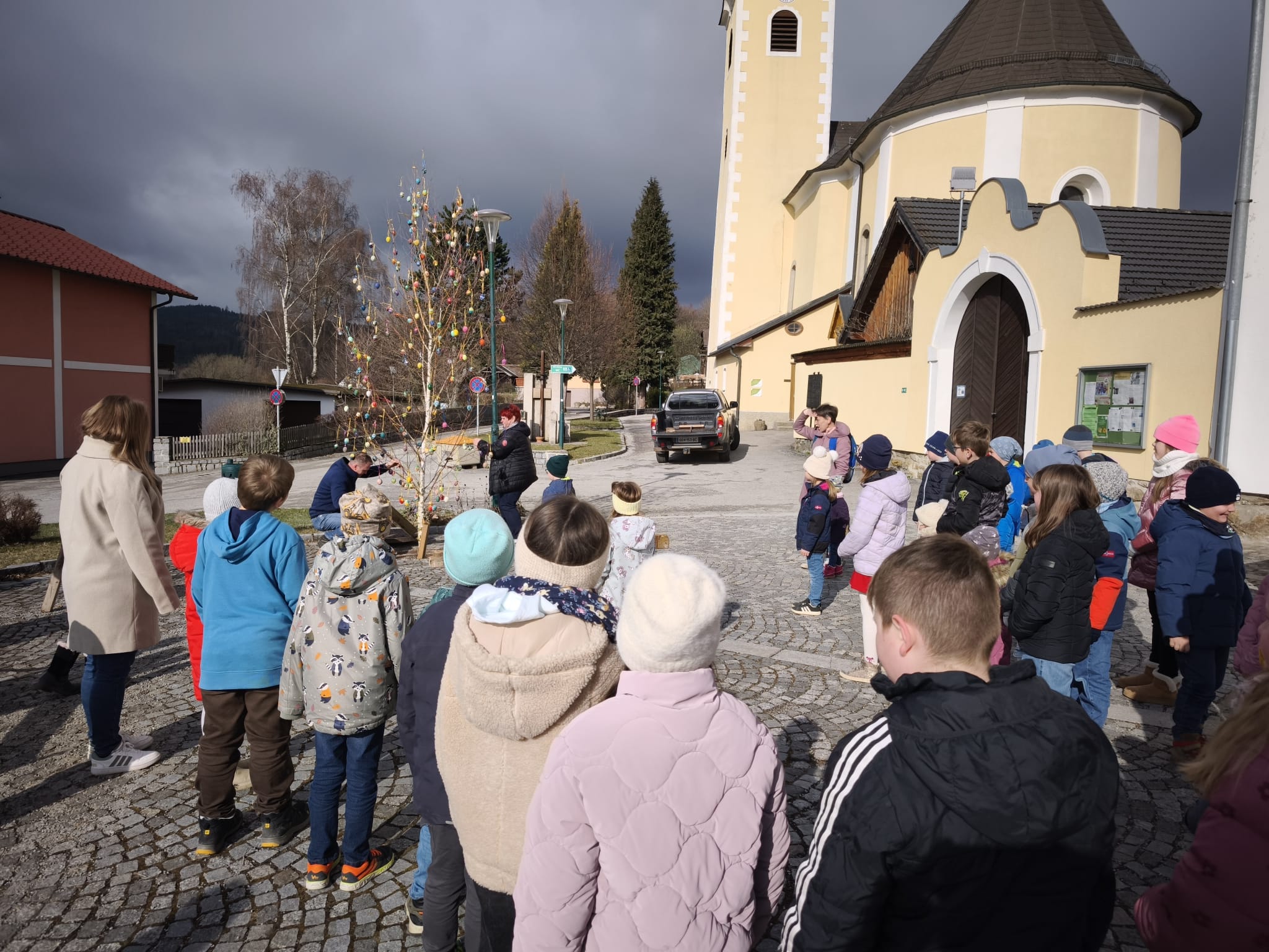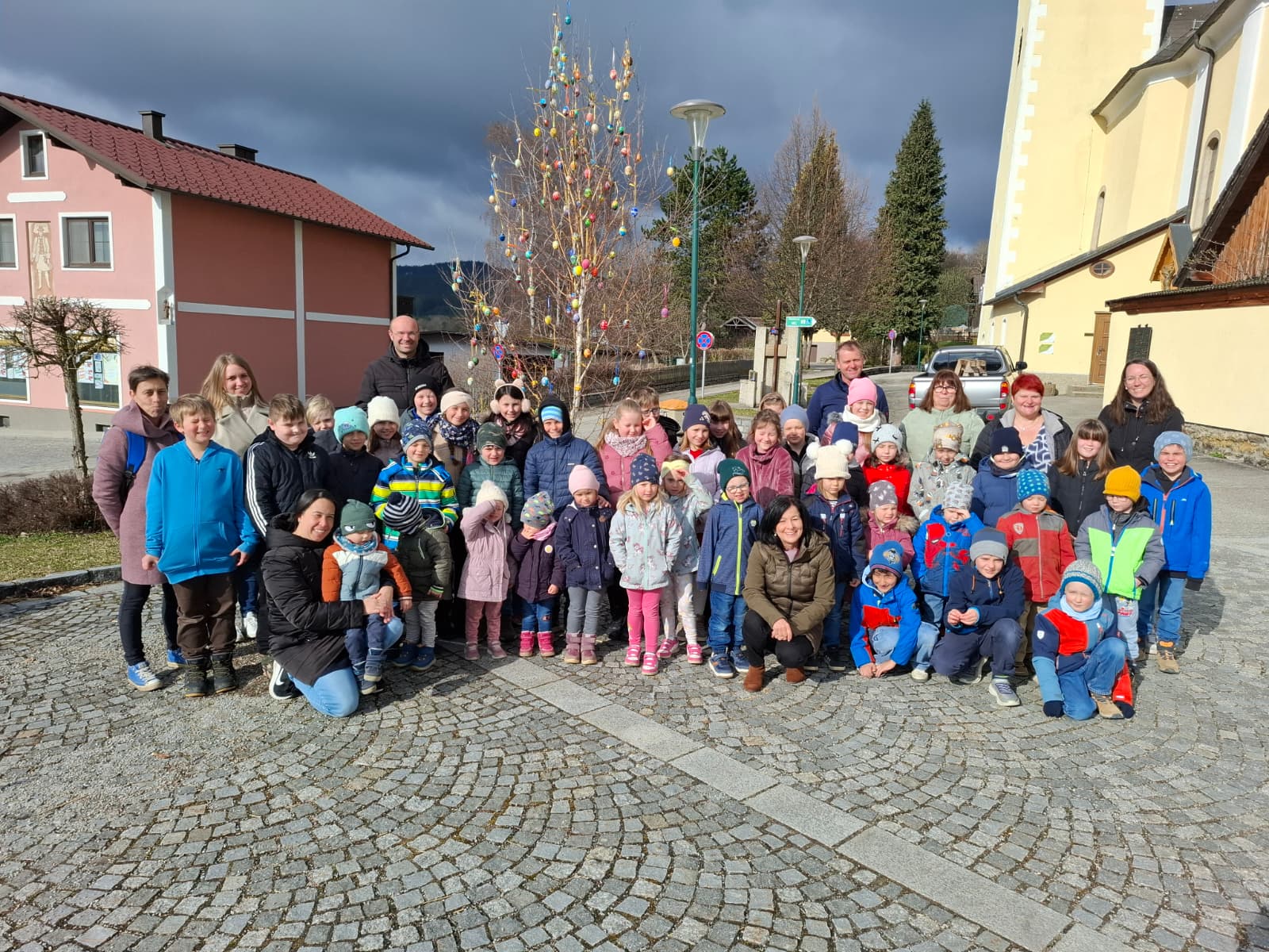 Kurz vor Ostern durften wir den Osterbaum schmücken. Gemeinsam trafen wir uns mit den Kindern des Kindergartens vor der Kirche und gestalteten einen bunten Baum.